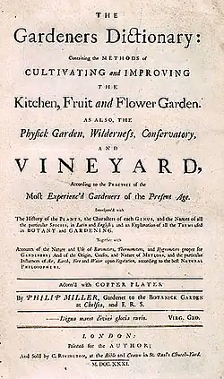 Miller widerstrebte es, die neue binomiale Bezeichnung von Carl von Linné zu verwenden, er bevorzugte die Klassifikationen von Joseph Pitton de Tournefort und John Ray. Erst 1768, mit der achten Auflage des Gardeners Dictionary, wechselte er zum Linnéschen System. Nomenklatorisch bedeutsam ist die 4. gekürzte Auflage des Gardeners Dictionary von 1754, in der etliche Gattungsnamen entsprechend den Regeln des Internationalen Code der Nomenklatur für Algen, Pilze und Pflanzen formal eingeführt wurden. Darunter die Lärchen (Larix)[1] und die Vanille (Vanilla)[2].