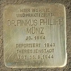 - ↑ Alfred Münz wurde am 29. September 1944 aus dem KZ Theresienstadt weiter ins KZ Auschwitz deportiert, wo er bald umkam.
