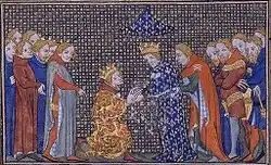 Durch diesen Erfolg ermutigt, sandte Philipp eine Delegation nach London, die den englischen König zur Leistung des Lehnseides für die Herzogtümer Aquitanien und Gascogne (Guyenne) aufforderte, wie es in den Verträgen von Paris 1259 und 1303 bestimmt worden war. Die Gesandtschaft scheiterte zunächst an der entschiedenen Ablehnung der regierenden Königinmutter Isabelle, der Tochter König Philipps IV. von Frankreich, und Schwester des vormaligen französischen Königs Karl IV., die darauf hinwies, dass Philipp von Valois als Sohn eines Grafen nicht über den Sohn eines Königs gebieten könne. Erst nachdem man dem englischen König die Entziehung seiner Lehen in Frankreich angedroht hatte, reiste Eduard III. nach Amiens, wo er im Juni 1329 die geforderte Huldigung gegenüber Philipp leistete und ihn durch diesen Akt als König von Frankreich anerkannte.