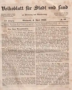 - ↑ Der folgende Verleger des Volksblatts war Reimar Hobbing in Berlin, nachgewiesen ab 1903, NDB 9, 1972, S. 279 f., der im Lauf der Zeit daraus ein großes Verlagsimperium schuf. Nach dem frühen Tod Hobbings 1919 nahm sein Verlag, insbes. in der NS-Zeit mit Kriegsschriften, einen enormen Aufschwung, teils unter anderen Namen (Steiniger). Spuren dieses Verlagsnamens sind bis 1990 in Essen (Rhld.) nachweisbar.