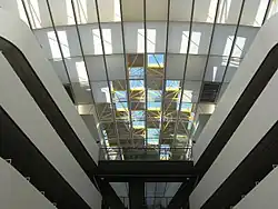 Alle Etagen sind in der Mitte eingeschnitten, wodurch eine symmetrische Mittelachse mit Atrium entsteht, an deren Endpunkt der Eingangsbereich, bzw. ihm gegenüber eine offene Treppenanlage liegt. Während der Bau durch seine Form- und Farbgebung insgesamt futuristisch anmutet, entsteht an einigen Stellen ein skurriler Gegensatz: So sind sowohl die Paneele am Eingang als auch das nur an einigen Stellen sichtbare Raumfachwerk der Gebäudehülle in den Farben Gelb-Orange gehalten. Damit wollte Norman Foster eine Verbindung zur Rost- und Silberlaube herstellen, die an bestimmten Stellen (Sonnenmarkisen und Teppichböden) ebenfalls eine Farbigkeit aufweist.