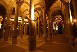 Das unterirdische Reservoir ist 64 Meter lang und 56,4 Meter breit.[6] Es bedeckt eine Fläche von ca. 3.600 m² und konnte 40.000 m³ Wasser aufnehmen.[4] Die Zisterne ist ein Hypostyl mit Gewölben.[4] Die 224 Säulen sind 12,4 Meter hoch, 0,6 bis 0,65 Meter dick und aus Marmor von der nahen Marmara-Insel. Sie stehen in 16 Reihen mit je 14 Säulen.[7] Die Säulen sind in der Höhe zweigeteilt mit dazwischenliegendem Marmorring. Die Fugen sind mit Blei ausgegossen.[6] Der Boden der Zisterne wurde später erhöht, so dass nur die obere Säule, der Marmorring und wenige Zentimeter der unteren Säule sichtbar sind. Die ursprüngliche Höhe ist in einem Bassin mit vier Säulen in der Mitte der Zisterne sichtbar. Die meisten Säulen und die Kapitelle tragen ein griechisches Steinmetzzeichen.[4] Wände und Gewölbedecken wurden aus Ziegelsteinen gemauert.