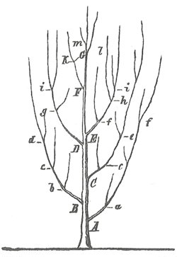 Im 14. Jahrhundert entwickelte der franziskanische Philosoph Wilhelm von Ockham das Abstammungsprinzip lex parsimoniae. Im Jahr 1763 wurde Pastor Thomas Bayes’ Grundlagenwerk zur Bayesschen Statistik veröffentlicht.[6] Im 18. Jahrhundert führte Pierre Simon Laplace, Marquis de Laplace, eine Form des Maximum-likelihood-Ansatzes ein. 1837 publizierte Charles Darwin die Evolutionstheorie mit einer Darstellung eines Stammbaums. Eine Unterscheidung der Homologie und der Analogie wurde erstmals 1843 von Richard Owen getroffen. Der Paläontologe Heinrich Georg Bronn publizierte 1858 erstmals das Aussterben und Neuauftreten von Arten im Stammbaum.[7] Im gleichen Jahr wurde die Evolutionstheorie erweitert.[8] Die Bezeichnung Phylogenie wurde 1866 von Ernst Haeckel geprägt.[9] Er postulierte in seiner Rekapitulations-Theorie einen Zusammenhang zwischen der Phylogenese und der Ontogenese, der heute nicht mehr haltbar ist.[10][11] Im Jahr 1893 wurde Dollo’s Law of Character State Irreversibility veröffentlicht.[12]