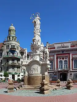 Vor dem repräsentativen Bau des Rathauses befindet sich die Statue des Heiligen Nepomuks und der Maria. Sie wurde 1753–1756 von den Wiener Bildhauern Blim und Wasserburger aus Sandstein geschaffen. In der Mitte des Standbildes hält der Heiligen Nepomuk, der Schutzpatron der katholischen Banater seit dem Jahr 1727, ein Kreuz. Über ihm befindet sich die Gottesmutter Maria mit einem Kranz auf dem Kopf. Die Statue erinnert an die Pestopfer von 1738 und 1739.[5]