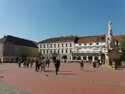 Auf dem Platz steht das Alte Rathaus (rumänisch Primăria Veche), das 1731–1734 nach den Plänen des italienischen Architekten Pietro del Bronzo auf den Grundmauern eines im Türkenkrieg zerstörten türkischen Bades[2] errichtet wurde, aber in den folgenden Jahrhunderten einige Änderungen erfuhr. Die Fassade ist eine Mischung aus Stilelementen des Barock und der Renaissance und beinhaltet mit dem Bild starker Türme in einer Festung das städtische Wappen. Hier ist auch der Sitz der Musik-Fakultät der Universität des Westens Timișoara.[3] In diesem östlichen Teil des Platzes befand sich auch die frühere Sparkasse, die 1855 von dem Architekten Karl Mai errichtet wurde,[4] sowie die Biblioteca Județeană George Barițiu (deutsch Kreisbibliothek George Barițiu).