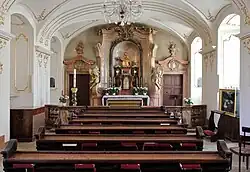 Der Innenraum der Kirche weist einen äußerst kompliziertem Grundriss auf[14], der Ende 2020 grundlegend neu vermessen wurde. Mit Hilfe von 3D-Laserscanning wurden 2D-Pläne der Kirche angefertigt.[15] Das Zentrum des kreuzförmigen Zentralraums bildet ein fast kreisförmiges Oval mit flacher Kuppel, das von sechs Seitenaltären umgeben ist.[13] Die Deckenfresken sind ein Hauptwerk von Franz Anton Maulbertsch: fünf Kuppelfresken, die der bedeutendste Maler des österreichischen Spätbarocks in den Jahren 1752 und 1753 schuf. In der Hauptkuppel befindet sich eine Darstellung der Krönung Mariens im Himmel, während den Rand Szenen aus dem Alten und Neuen Testament bilden. Alle Figuren sind ineinander verschlungen, wie in einem wogenden Fluss; in der Komposition dominiert die Farbe über die Kontur. Die Konstruktion, die etwa bei Daniel Gran, dem frühen Paul Troger und später beim Klassizismus im Vordergrund steht, tritt zugunsten des Spiels von Licht und Farbe zurück.[16]