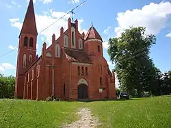 - Kirche, 1900 gebaut, neogotischer Backsteinbau