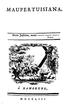 Maupertuis geriet aber bald in verschiedene Querelen, unter anderem weil er kaum Deutsch konnte. Eine der Querelen wurde ausgelöst von Johann Samuel König, der Maupertuis’ Werk über Lappland übersetzt hatte. Er warf Maupertuis vor, das von ihm in seinem Essai de cosmologie 1750 formulierte „Prinzip der kleinsten Wirkung“ stamme von Leibniz.[7] Als der Akademiepräsident dies ungeschickt bestritt, wurde er von Voltaire, der seit Juli 1750 in Berlin und Potsdam lebte und Mitglied der von Maupertuis geleiteten Akademie war, mit dem anonym veröffentlichten Pamphlet Diatribe du Docteur Akakia attackiert. Friedrich II. hielt zu Maupertuis und verlieh ihm 1750 den an sich nur für kriegerische Leistungen gestifteten preußischen Orden Pour le Mérite, der sehr selten an Zivilpersonen vergeben wurde.[8] 1752 erklärte die von Maupertuis geleitete Akademie den Brief Leibniz‘ für apokryph und zieh Johann Samuel König der Fälschung. Als Maupertuis im selben Jahr die Lettres sur des sujets divers veröffentlichte, lösten einige darin enthaltene krude Ideen allgemeinen Spott aus, an dem sich auch Friedrich mit einem Pamphlet beteiligte. Voltaire und Maupertuis wetteiferten allabendlich an der Tafelrunde des Königs um dessen Gunst, was in eine scharfe Rivalität ausartete.[9] Im September 1752 veröffentlichte Voltaire anonym die Réponse d'un académien de Berlin à un académien de Paris, in der er Maupertuis vorwarf, er tyrannisiere und entehre die Akademie. Friedrich griff nun selbst zur Feder und nahm seinen Akademiepräsidenten in Schutz. Er nahm Voltaire das Versprechen ab, den Akakia nicht nochmals drucken zu lassen und auch sonst nichts mehr gegen Maupertuis zu schreiben. Voltaire hatte sich bereits 1751 den Unmut des Königs zugezogen, als er sich mit dem Berliner Schutzjuden Hirschel in einen Betrugsprozess verstrickte. 1752 ließ Voltaire heimlich eine zweite Auflage des Akakia in Leipzig drucken, die Friedrich im Dezember 1752 in einem Autodafé vom Berliner Henker öffentlich verbrennen ließ. Voltaire schickte ihm im Januar 1753 den Kammerherrenschlüssel und seine Orden zurück und reiste Ende März nach Sachsen ab, vorgeblich zu einer Kur und mit dem Versprechen zurückzukommen, was er aber nicht tat. In Leipzig veröffentlichte er zwei weitere Broschüren gegen Maupertuis und einen Brief Maupertuis’, den er durch eine „kleine Korrektur“ zum Drohbrief entstellt hatte. Im April schrieb ihm der König einen verärgerten Brief. Maupertuis nahm im Sommer 1753 seinen Abschied als Akademiepräsident und reiste nach Paris, Nachfolger wurde der Marquis d’Argens. Friedrich schrieb an Maupertuis: „Ich nehme an, daß Sie jetzt recht glücklich sind, fern von dem Gezänk und den Akakias… Was für einen Wirbel ein Narr in einer Gesellschaft verursachen kann! Ich vermisse ungern den Geist des meinigen; aber sein Charakter tröstet mich über seinen Verlust.“ Maupertuis kehrte im Herbst nach Berlin zurück.