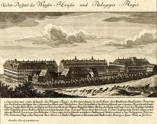 Der Hallische Pietismus (oder Hallesche Pietismus) geht ebenfalls auf Spener zurück, der die Universität Halle mitgründete. Speners bekanntester Schüler war der Theologe und Pädagoge August Hermann Francke (1663–1727).[42] Nach seinem umstrittenen Wirken in Leipzig und Erfurt wurde er als Professor für Griechisch und orientalische Sprachen an die neugegründete Universität und als Pfarrer des Vorortes von Halle, Glaucha, berufen. Er ist Begründer des Waisenhauses in Halle an der Saale, aus dem umfangreiche pädagogische und wissenschaftliche Anstalten mit vielen verschiedenen Zweigen hervorgingen (Franckeschen Stiftungen).[43] Mit Carl Hildebrand von Canstein (1667–1719) gründete er die Cansteinsche Bibelanstalt, die älteste Bibelgesellschaft der Welt.[44] Die von Francke begonnene Dänisch-Hallesche Mission entsandte die ersten evangelischen Missionare nach Indien, Bartholomäus Ziegenbalg und Heinrich Plütschau.[45] Halle wurde zum wichtigsten Zentrum des lutherischen Pietismus, neben dem aber auch viele andere Zentren in und außerhalb Deutschlands entstanden. So bekam der Hallische Pietismus während der Regierung Christian VI. in Dänemark, Norwegen und den mit ihm verbundenen Herzogtümern Schleswig und Holstein starken Einfluss auf die Kirche. Seine Ausstrahlung war international.