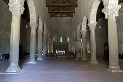 Die Kirche ist basilikal angelegt, sie verfügt dementsprechend über drei Kirchenschiffe mit erhöhtem Mittelschiff. Die Kirche ist lediglich in der vordersten Querachse in den Seitenschiffen überkuppelt, ansonsten ist der hölzerne Dachstuhl frei sichtbar. Die Arkadenbögen werden von nicht regelmäßig gestellten Säulen mit teilweise kräftiger Entasis getragen, wobei die zweiten Säulen vor der Apsis beiderseits durch Pfeiler ersetzt wurden.