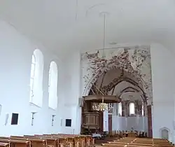 Apsis – oben freigelegte Wandmalereien; Fensternischen bis weit nach unten