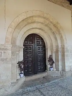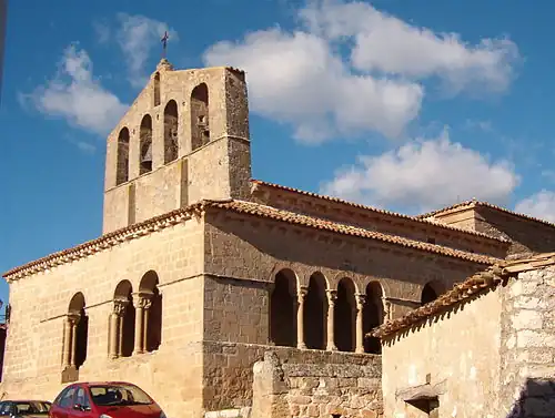 - Die eindrucksvolle Iglesia de la Anunciación entstand im ausgehenden 12. und beginnenden 13. Jahrhundert; der vierbogige Glockengiebel (espadaña) ruht auf der ansonsten schmucklosen Westwand der Kirche. Diese ist im Westen und Süden umgebende Portikus (galería porticada) besteht aus Doppelsäulen mit zumeist vegetabilisch dekorierten Kapitellen. Die verputzte Portalzone tritt um ca. 50 cm aus der Flucht des Mauerwerks heraus – so konnte ein Stufenportal mit vier Archivolten entstehen. Das Kirchenschiff (nave) ist gratgewölbt; die Apsis ist schmucklos.[7]