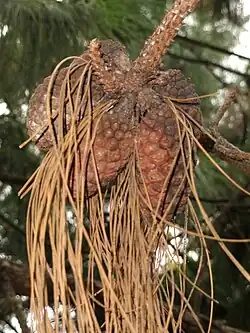 Die Pollenzapfen sind bei einer Länge von etwa 2 Zentimetern kurz zylindrisch und gelb. Die Samenzapfen wachsen paarweise oder in Wirteln von bis zu fünf kurz gestielten oder beinahe sitzenden Zapfen. Die Samenzapfen sind bei einer Länge von 5 bis 10 manchmal 11 Zentimetern, beinahe symmetrisch, geschlossen eiförmig-konisch mit Durchmessern von 3,5 bis 4,5 Zentimetern und geöffnet mit Durchmessern von 5 bis 7 Zentimetern. Sie öffnen sich früh, bleiben dann jedoch noch mehrere Jahre am Baum. Die Samenschuppen sind holzig, steif, länglich bis verkehrt-eiförmig und stehen mit Ausnahme der Basis weit waagrecht ab. Die Apophyse ist erhöht, unterschiedlich geformt, quer gekielt und reift von grün zu hell- bis kastanien-braun. Der Umbo ist flach oder erhöht und mit einem kleinen Stachel bewehrt. Die Samen sind eiförmig, 4 bis 5 Millimeter lang und braun. Der Samenflügel ist 12 bis 15 Millimeter lang, etwa 6 Millimeter breit, hell-braun oder grau-braun. Die Bestäubung erfolgt im April und Mai, die Samen reifen im Oktober.[1][3]