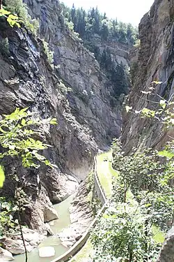- Weg vier ist die Kantonsstrasse, gebaut 1818. Sie wurde auf die Trasse der Mulattiera Urana gelegt, rund 3 m über dieser, wurde gleichzeitig auf 4 m verbreitert und erhielt einen Kiesbelag. Nun konnte die Schlucht mit Kutschen, später mit Autos durchfahren werden. Eine Haarnadelkurve der Mulattiera Urana, zu eng für Wagen, wurde über eine Brückenkonstruktion umfahren und blieb erhalten. Sie kann auch heute noch begangen werden. Mehrere Hochwasser (1834, 1839, 1868…, 2013 [2 ×], 2020) beschädigten die Strasse schwer. Dabei kamen, 3 m unter der Strasse, weitere Stücke des Saumpfades von 1561 zum Vorschein. Die Kantonsstrasse wurde immer wieder mit grossem Aufwand instandgestellt.[2]