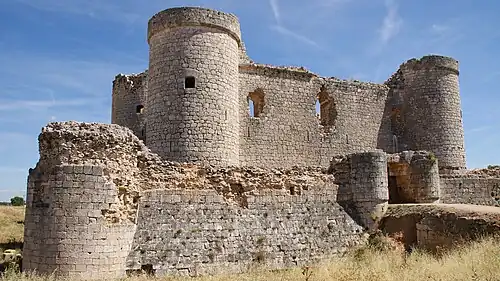 - Die Burg (castillo) wurde in der zweiten Hälfte des 15. Jahrhunderts vom letzten der beiden Mendozas und dessen Sohn Alvar Gómez erbaut. Es handelt sich um einen viertürmigen Bau auf quadratischem Grundriss mit einem umgebenden Zwinger und einem Wassergraben (foso).[8]