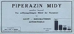 Die historische Verwendung von Piperazin zur Behandlung der Gicht beruhte auf der Beobachtung, dass es in vitro die Harnsäure aufzulösen vermag. Wesentlich niedriger war jedoch die Wirksamkeit in vivo, also im menschlichen Körper. Piperazin wird zwar gut resorbiert, jedoch auch schnell wieder ausgeschieden. Die Ausscheidung erfolgt über den Urin.