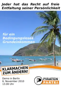 Plakat anlässlich der Demonstration zum Bedingungslosen Grundeinkommen der Piratenpartei Deutschland am 6. November 2010, Berlin
