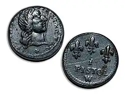 Eine Pistole war ursprünglich eine spanische Geldmünze aus amerikanischem Gold, die seit 1566 als doppelter Escudo geprägt wurde. Sie zeigte das spanische Wappen und die Säulen des Herakles. Ab 1640 führten Frankreich (im Wert von 10 Livre, später als Louis d’or geprägt) und Genua (im Wert von 50 genueser Lire) den Doppelescudo unter dem Namen Pistole ein.[1][2]