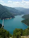 | Der Piva-Stausee bei Plužine, im Hintergrund der Maglić | ||