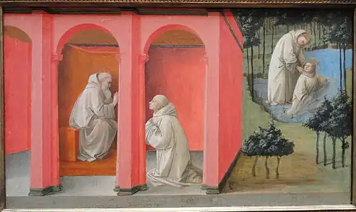 Eines Tages, so berichtet die Legende, fiel der junge Placidus in einen Teich und drohte zu ertrinken. Sein Mitbruder Maurus wurde von Benedikt ausgesandt, um den Jungen aus dem Wasser zu ziehen, was ihm auch gelang. Erst im Nachhinein bemerkte Maurus, dass er auf dem Wasser gewandelt war, was Placidus auf den Segen ihres geistlichen Vaters zurückführte.[1]
