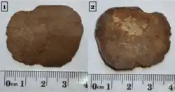 Die äußere (1) und innere (2) Seite der Placodermplatte. Russland, Leningrader Gebiet, Bezirk Gatschina.