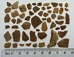 Fragmente von Placodermplatten. Russland, Leningrader Gebiet, Bezirk Gatschina. Gefunden in devonischen Schwemmlandablagerungen des Flusses Oredesch.Phyllolepida
