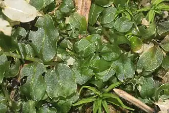 Die Blätter sind rundlich eiförmig und bis 5 Millimeter lang, die der fertilen Triebe mehr zungenförmig und bis 6 Millimeter lang. Die Blätter sind oben kurz bespitzt, am Rand mit langgestreckten Zellen gesäumt und gezähnt, die Zähne sind kurz, stumpf, meist einzellig und eher anliegend. Der Blattgrund läuft am Stämmchen nicht oder nur sehr kurz herab. Die Blattrippe endet kurz vor oder in der Blattspitze. Trocken Blätter sind gekräuselt und stark geschrumpft.