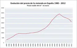 - ↑ Gemäß Daten des Spanischen Amts für Statistik und dem Wohnungsministerium in grafischer Abbildung aufbereitet in: Ada Colau, Adrià Alemany: Vidas hipotecadas. De la burbuja inmobiliaria al derecho a la vivienda. 1. Auflage. Angle Editorial – Cuadrilátero de Libros, Barcelona 2012, ISBN 978-84-940037-3-8, S. 28 (afectadosporlahipoteca.com [PDF]).