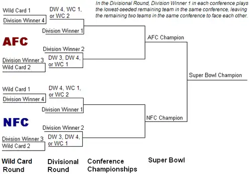 In den beiden Conferences werden zunächst getrennt die Sieger ausgespielt. Die erste Runde der Play-offs wird als Wild Card Round bezeichnet. In dieser Runde empfangen der Divisionssieger mit Nr. 2 das Wildcard-Team mit Nr. 7, der Divisionssieger mit Nr. 3 das Wildcard-Team mit Nr. 6 und der Divisionssieger mit Nr. 4 das Wildcard-Team mit Nr. 5. Der Divisionssieger mit Nr. 1 hat ein Freilos, d. h., er steht automatisch in der 2. Runde, der Divisional Round, und hat dort Heimrecht gegen einen der Sieger der Wild Card Round. Im Gegensatz zur NBA hat die NFL keinen fix vorgegebenen Spielplan, sondern es spielt in jeder Runde das jeweils am höchsten gesetzte Team gegen das am niedrigsten gesetzte Team.[2] Die beiden Sieger der Divisional Round stehen sich dann im jeweiligen Conference Championship Game gegenüber. Sie ermitteln dabei nicht nur den Sieger der Conference, sondern auch den Teilnehmer am Super Bowl. Bei den Ansetzungen genießt jeweils das höher gesetzte Team Heimrecht. Eine Ausnahme hiervon bildet der Super Bowl, bei dem das Heimrecht jährlich zwischen NFC und AFC wechselt. Nur dreimal seit 1990 hat ein Team, das nicht als Nr. 1 oder 2 gesetzt war, das Heimrecht für das Conference Championship Game erreicht (AFC Championship 2006 und NFC Championships 2008 und 2021).