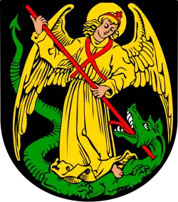 Blasonierung: „In Schwarz ein goldener Engel mit goldenen Flügeln, goldener Gloriole und rotem Schulterriemen, rotem Kreuzstirnband und roter Lanze, damit einen auf dem Rücken liegenden rotbezungten grünen Drachen tötend.“[10] |