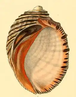 Gehäuse von Plicopurpura patula. Lovell Augustus Reeve, 1843 (Conchologia iconica) | ||||||||||||