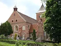 Die heutige nach St. Laurentius benannte römisch-katholische Kirche stammt aus dem 14. Jahrhundert.[8][6] Sie war schon vor 1945 katholisch. Ihre Grundmauern sind aus Feldsteinen, 1801 wurde sie nach Westen hin erweitert und um einen Turm ergänzt.[8] Der Hochaltar von 1694 und die Seitenaltäre von 1697 stammen wohl aus der Werkstatt von Isaak Riga aus Königsberg (Preußen), und die Kanzel ist auch ein Werk des Barock. Das Gebäude wurde 1945 zugunsten der Römisch-katholischen Kirche in Polen zwangsenteignet.