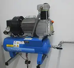 - Für die erforderliche Verdichtung der Luft ist eine bestimmte Aufwendung an elektrischer Energie am Kompressor erforderlich. Aufgrund thermodynamischer Prozesse entsteht hierbei eine große Menge Wärme. Diese ist zwar kein direkter Indikator für Energieverluste (siehe Abschnitt „Exergie“), trotzdem zeigen Untersuchungen, dass aufgrund der mechanischen und thermischen Prozesse während der Komprimierung hohe Verluste auftreten. Insbesondere in alten und schlecht gewarteten Anlagen ist daher der Gesamtwirkungsgrad pneumatischer Systeme oftmals gering.