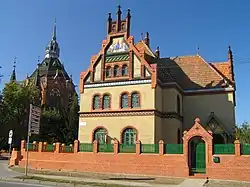 • Pfarrhaus, das zum Ende des 19. Jahrhunderts errichtete Gebäude steht auf einem hohen, durch ein Gesims abgeschlossenen Ziegelsockel. Es wurde 1909 durch Carl Weinbrenner mit Elementen des Jugendstils verziert. Das Giebelmosaik zeigt ein Paar in podluzakischer Festtracht, dass sich vor der Jungfrau Maria verbeugt.[12]