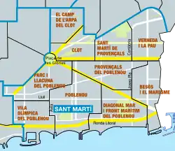 El Poblenou ist ein Teil des Stadtbezirks Sant Martí. Der Ortsteil grenzt im Südwesten an den Hafen von Barcelona und im Südosten direkt an die offene See.