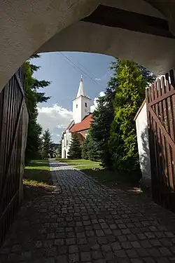 - Die ehemals evangelische Herz-Jesu-Kirche (kościół p.w. Najświętszego Serca Jezusowego) ist eine für das Brieger Land typische mittelalterliche Backstein-Dorfkirche. Sie ist für das Jahr 1273 erstmals bezeugt und wurde in ihrer heutigen Form samt Kirchhofsmauer im 14. Jahrhundert und 15. Jahrhundert, der Frontturm um das Jahr 1600 errichtet.[8] Im Chorraum finden sich bedeutende gotische Fresken vom Ende des 15. Jahrhunderts, weshalb die Kirche eine Station des 53 km langen Kulturwegs der Brieger Polychromien (Szlak Polichromii Brzeskich) ist.[9] Das Schloss steht seit 1964 unter Denkmalschutz.[10]