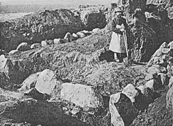 Da der Hügel akut durch Kiesabbau bedroht war, entschloss sich der Bernburger Altertumsverein 1904 zu einer Grabung, die im September desselben Jahres unter Leitung von Paul Höfer durchgeführt wurde. Hierbei wurden auf Höhe der Hügelsohle zur Mitte hin zunächst zehn Schnitte mit einer Breite von jeweils etwa 2 m angelegt: Zwei von Osten, jeweils drei von Norden und Süden und jeweils einer von Südosten und Nordosten. Die Schnitte erhielten später Nummern, von denen sich zum Teil die Nummerierungen der in ihnen angetroffenen Gräber ableitete. Nachträglich wurden noch ein weiterer Schnitt auf der Nordseite und drei auf der Westseite angelegt, die aber fundleer blieben.[2]