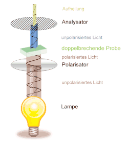 Wird ein optisch anisotropes Material so orientiert, dass die erlaubten Schwingungsebenen im Kristall schräg zur Polarisationsebene des anregenden Lichtes liegen, so wird das Licht im Kristall in zwei Strahlen mit zueinander senkrechten Polarisationsebenen aufgespalten (ordentlicher und außerordentlicher Strahl). Von diesen werden von dem in Kreuzstellung befindlichen Analysator gewisse Anteile hindurchgelassen und es kommt zu einer Aufhellung des Bildes.