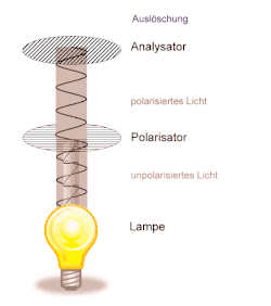 2. Optisch anisotrope Materialien sind so strukturiert, dass das Licht in ihnen nur in zwei aufeinander senkrecht stehenden Richtungen schwingen kann. Liegt eine dieser Richtungen parallel zur Polarisationsrichtung des anregenden Lichtes (auch Normalstellung genannt), so bleibt die Schwingungsrichtung beim Durchstrahlen der Probe erhalten. Daher wird das Licht vom Analysatorfilter vollständig blockiert. Für jeden anisotropen Kristall gibt es durch Drehung genau vier Orientierungen mit Auslöschung, die alle senkrecht aufeinander stehen.