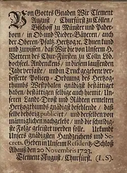 Die Policeyordnung für Westfalen von 1723 stellt in diesem Kontext die letzte im Kölner Kurstaat erlassene, alle Bereiche umfassende Gesamtordnung dar. Grundlage waren die vorangegangenen Ordnungen für das Herzogtum Westfalen von 1645[5] und 1656[6] wie auch die Kölner Ordnungen von 1537[7]/1538[8] und 1595[9]. Gleichzeitig markiert sie eine Phase des Herrschaftsüberganges in Kurköln, da Kurfürst Joseph Clemens nur knapp zwei Monate nach ihrem Erlass starb. Sein Nachfolger Clemens August bestätigte sie bereits am 20. November 1723 bei einem Aufenthalt in Schloss Ahaus. Clemens August versuchte in der Folge bis 1739 mehrmals, die westfälische Ordnung auf den rheinischen Teil des Kurfürstentums auszuweiten, was aber am Widerstand der dortigen Landstände scheiterte. Dadurch verstärkte sich in Kurköln die Tendenz, die Policey durch Einzelverordnungen festzusetzen, da hierbei nicht generell die Zustimmung der Landstände bzw. des Domkapitels erforderlich war.[10]