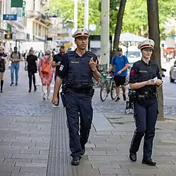 Ab 1971 wurden 18- bis 25-jährige Frauen in den Städten nach einer drei Monate dauernden Ausbildung als weibliche Straßenaufsichtsorgane zur Überwachung des ruhenden Verkehrs aufgenommen. Die ersten 34 Politessen wurden in sechs Wiener Bezirken eingesetzt, wo ihre Zahl Anfang der 1980er-Jahre auf etwa 200 anstieg. Ab Dezember 1990 ermöglichte ihnen eine einjährige Ergänzungsausbildung die Aufnahme in den regulären Polizeidienst.[12] Seit 1991 sind Polizistinnen ihren männlichen Kollegen hinsichtlich aller Rechte und Pflichten gleichgestellt. 2015 lag der Frauenanteil bei der Polizei in Wien bei 17 Prozent.[14] 2017 gab es österreichweit 27.255 Polizisten, davon waren 4.248 Frauen (15,59 Prozent).[15]