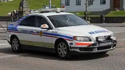 Die isländischen Polizeifahrzeuge sind weiß mit reflektierenden Markierungen in blau und rot. Sie tragen an den Längsseiten den isländischen Polizeistern und den blauen Schriftzug Lögreglan. Die Rundumkennleuchten sind blau.[10]