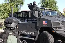 Alle überregionalen und inzwischen auch sehr viele lokale Polizeibehörden unterhalten ein oder mehrere als SWAT-Team (Special Weapons and Tactics) bezeichnete Spezialeinheiten für besondere Gefahrensituationen. Sie sind besonders ausgerüstet (weapons) und ausgebildet (tactics) für spezielle Einsätze, mit denen die allgemeinen Polizeikräfte überfordert wären. Seit 2001 werden alle Polizeieinheiten und besonders die SWAT-Teams verstärkt auf die Terrorabwehr ausgerichtet. Dieser Trend beschleunigte sich mit dem Abzug der US-Armee aus dem Irak und Afghanistan. Die Armee stellt seitdem nicht mehr gebrauchte Ausrüstung wie Waffen, gepanzerte Fahrzeuge, aber auch Kommunikations- und Überwachungsgeräte allen Polizeieinheiten kostenlos zur Verfügung und trainiert sie in deren Gebrauch (siehe unten). In der Folge wird Polizeibehörden im ganzen Land vorgeworfen,[9] dass sie ihre Arbeit verstärkt unter militärischen Gesichtspunkten ausführen und das polizeiliche Gegenüber als militärischen Feind behandeln würden. Davon werden weit überproportional Minderheiten, insbesondere Afroamerikaner und Latinos betroffen.[10] Durchsuchungen wegen geringfügigen Drogendelikten werden von SWAT-Teams mit gepanzerten Fahrzeugen und schweren Waffen durchgeführt.