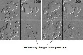 - ↑ C. J. Hansen, u. a.: HiRISE observations of gas sublimation-driven activity in Mars’ southern polar regions: I. Erosion of the surface. In: Icarus. Band 205, 2010, S. 283–295, doi:10.1016/j.icarus.2009.07.021.