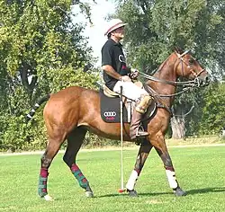 Auch wenn die Regeln es zulassen, Polo auf jedem beliebigen Pferd zu spielen, kommen doch zumeist speziell gezüchtete Poloponys zum Einsatz, die überwiegend aus Argentinien stammen (Polo Argentino). Das Stockmaß der Poloponys liegt in der Regel bei etwa 1,50 m. Die AACCP, der argentinische Verband der Züchter von Polopferden, definiert als Stockmaß des „Polo Argentino“ seit 1984 1,56 m. Zum größten Teil werden Stuten zum Polospielen verwendet. Durchaus oft werden auch ehemalige Rennpferde zu Polopferden umgeschult und in Spielen verwendet, oder es wird mit ihnen gezüchtet. Das Bemerkenswerte ist, dass die Pferde, die von Natur aus scheue Fluchttiere sind, beim Polo Kampf- und Jagdgeist entwickeln müssen und es zulassen, dass rund um ihren Kopf mit dem Schläger hantiert wird.