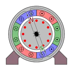 Da magnetische Pole nur paarweise auftreten können, ist die kleinste Polpaarzahl (1 Nordpol + 1 Südpol). Adäquat dazu wird die Polzahl mit bezeichnet. Eine vierpolige Maschine besitzt somit 2 Polpaare.[3] Dies ist folgendermaßen zu verstehen: Im einfachsten Fall, wie bei einer Gleichstrommaschine, bezieht sich die Polpaarzahl auf deren Hauptpolfeld, also das magnetische Feld, welches im Stator durch von Gleichstrom durchflossenen Spulen erzeugt wird. Dieses konstante Magnetfeld hat einen Nord- und einen Südpol. Die Maschine hat somit eine Polpaarzahl von 1.
