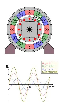 Bei einer Polpaarzahl von bewegt sich die Welle des Luftspaltfeldes somit exakt innerhalb einer elektrischen Periode eine komplette Umdrehung über den Umfang der Maschine. Bei einer Polpaarzahl von bewältigt das Luftspaltfeld gerade mal ein Viertel des Umfanges innerhalb einer Periode. Somit werden vier Perioden benötigt, um den vollen Umfang zu durchlaufen.[8]