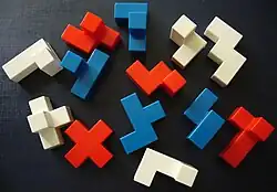 - ↑ Vgl. Stewart T. Coffin: Geometric Puzzle Design. Wellesley (MA): A. K. Peters Ltd., 2016, ISBN 978-1-56881-499-5, S. 45 (The 3 × 3 × 3 Cube). Online unter: The Puzzling World of Polyhedral Dissections., Kap. 3: Cubic Block Puzzles. Oxford University Press 1991.