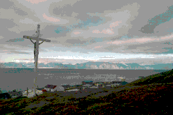 ![]() Nach dem verheerenden Brand von 1994 neu errichtete katholische Kirche von Pond Inlet; auf der gegenüberliegenden Seite des Eclipse Sound: Bylot Island | |||