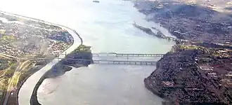 Zwischen 1951 und 1959 wurde mit dem Sankt-Lorenz-Seeweg eine Wasserstraße für Hochseeschiffe bis zur Seawaymaxklasse zwischen dem Oberen See und Montreal gebaut, die mit zahlreichen Kanälen und Schleusen ausgestattet ist und in Montreal dem Südufer des Sankt-Lorenz-Strom folgt. Dazu mussten alle kreuzenden Verkehrswege angepasst werden. Am südlichen Ende des Pont Ferroviaire Saint-Laurent und des Pont Honoré-Mercier entstand durch den Bau eine etwa 300 Meter breite und zwei Kilometer lange Insel zwischen Fluss und Kanal, von der aus für die Eisenbahnstrecke der CPR zwei eingleisige Hubbrücken über den Sankt-Lorenz-Seeweg errichtet wurden. 2012 passierten hier etwa 11 Schiffe täglich die Wasserstraße,[14] die Öffnung der Brücken ist aber dem schienengebundenen Personenverkehr untergeordnet.[17] Die Zufahrten zu den Straßenbrücken wurden hier soweit erhöht, dass diese für die Schiffe kein Hindernis darstellen.
